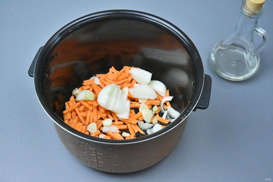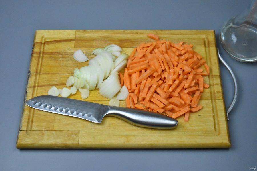 Очистите лук, чеснок и морковь. Нарежьте морковь брусочками, лук полукольцами. Чеснок измельчите.