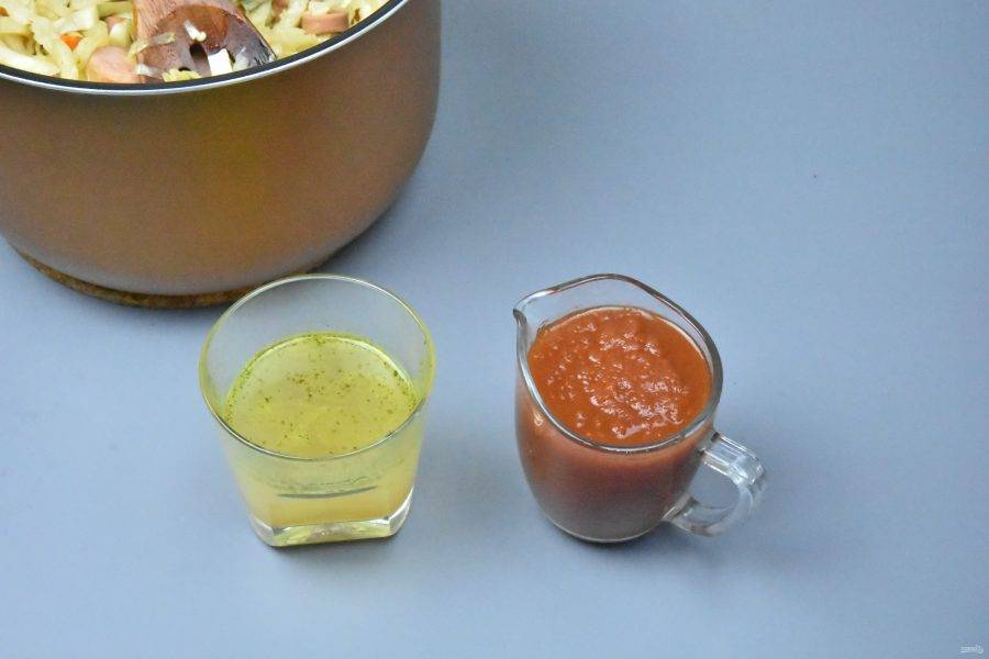 Подготовьте заливку из томатного соуса и бульона. Вместо бульона можно использовать воду или разведенный в воде бульонный кубик. Томатный домашний соус можно заменить консервированными томатами в собственном соку или томатной пастой. Обязательно сбалансируйте кислый вкус томатов добавлением сахара. Добавьте томат и бульон в капусту.