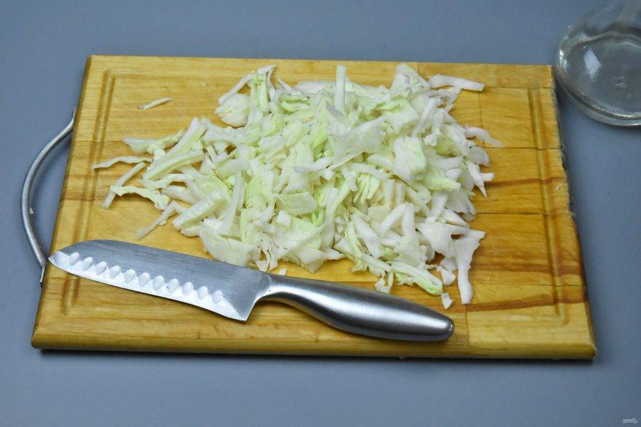 Пока обжариваются овощи, подготовьте капусту, нарезав ее брусочками.