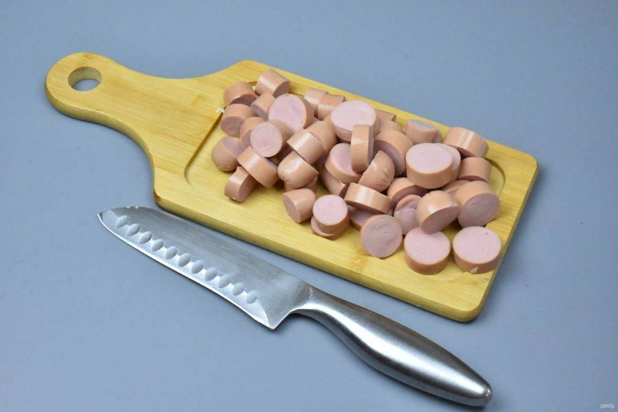 Сосиски нарежьте кружочками, толщиной около 1 сантиметра.