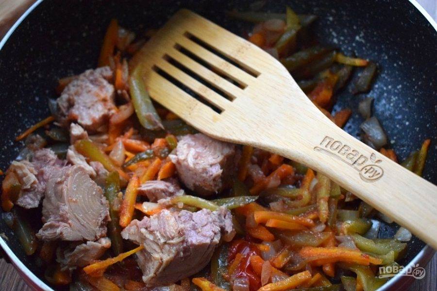 Добавьте филе тунца и 1/2 стакана бульона, перемешайте и готовьте в течение 2х минут.