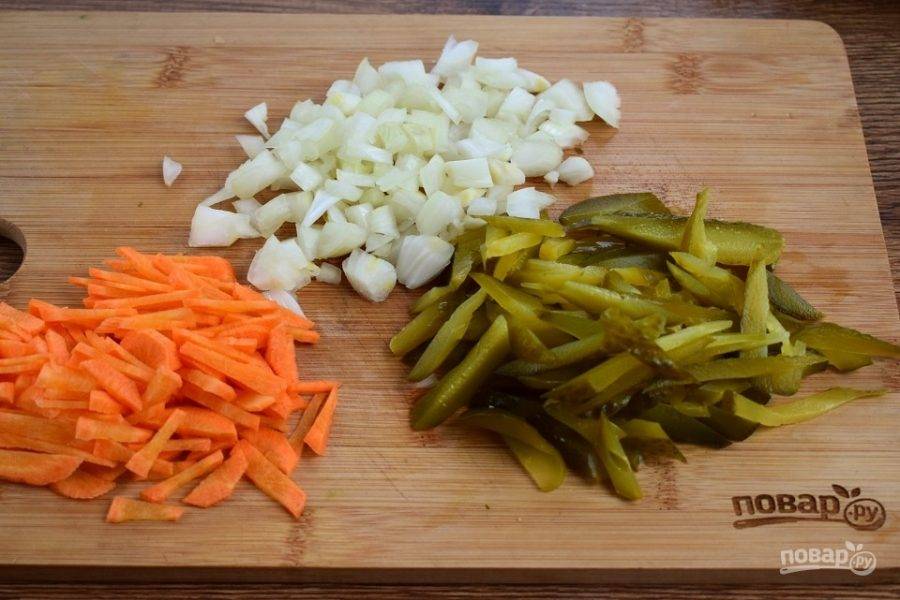 Лук измельчите, морковь и огурцы нарежьте соломкой.