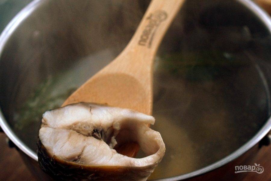 Рыбу нарежьте на порционные кусочки. Опустите рыбу в кипяток с лавровым листом, варите в течение 20 минут.