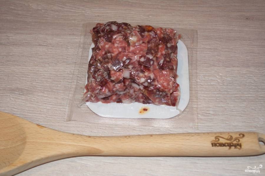Извлеките содержимое упаковки и добавьте в сковороду к зажарке. Перемешайте. Тушите все вместе около 5-7 минут. Можно немного подлить водички.