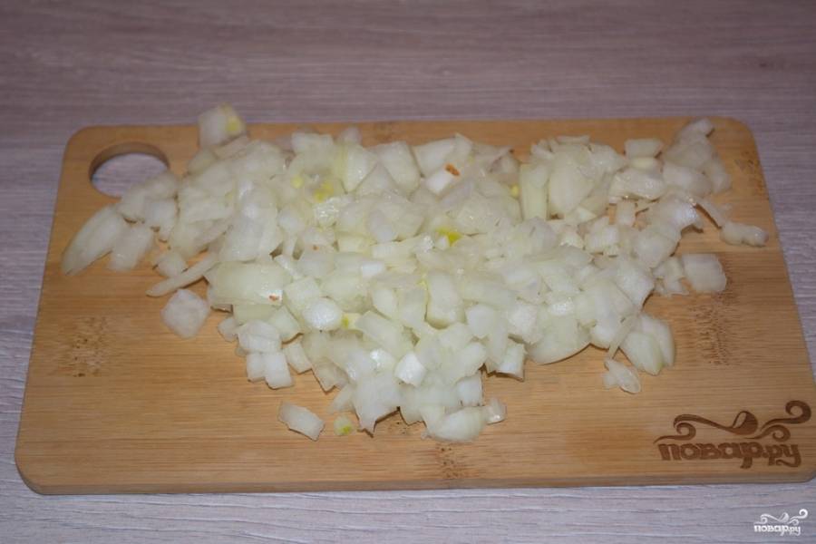 Куриное филе нужно вымыть и поместить в кастрюлю. Залить водой и поставить вариться. Варим 20 минут. Для приготовления солянки репчатый лук нарезаем небольшими кубиками.