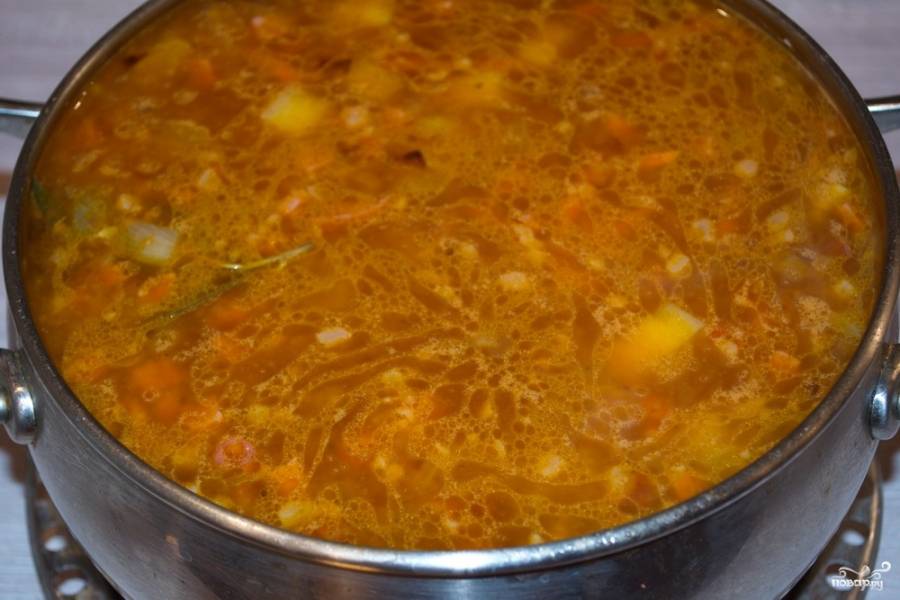 Когда картошка в бульоне будет почти готова, добавьте в бульон зажарку и отдельно варившиеся огурцы вместе в водой, в которой они варились.