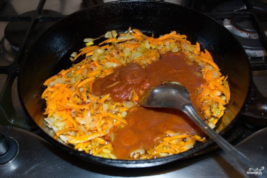 К обжаренным овощам добавляем томатную пасту. Перемешиваем.