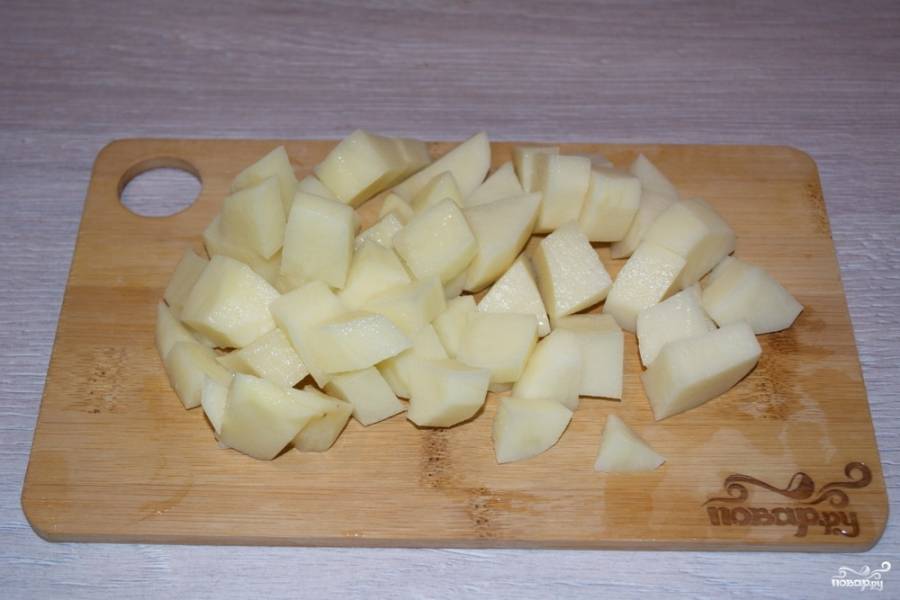 Очистите картофель. Нарежьте его на небольшие кусочки. Картофель добавьте в кипящий бульон. Извлеките из бульона мясо. Нарежьте его кусочками и верните в бульон.