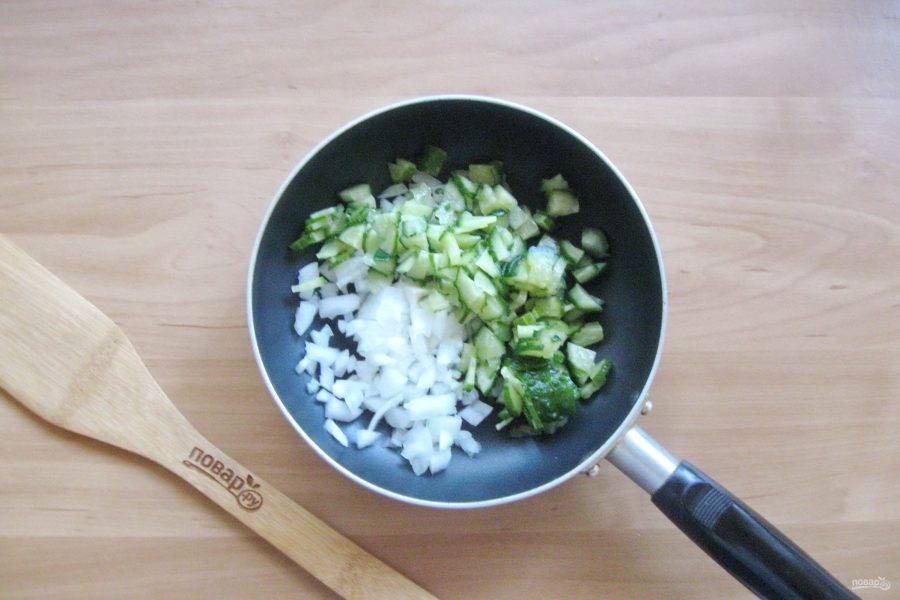 Соленый или маринованный огурец нарежьте кубиками или натрите на терке. Добавьте к луку.
