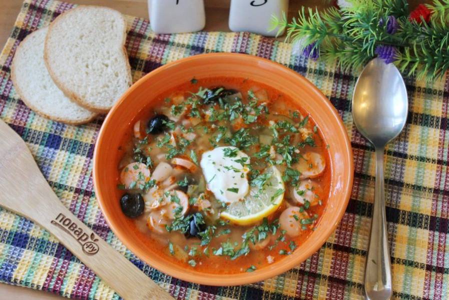 Подавайте солянку к столу к ломтиком лимона, нарезанной зеленью и сметаной.