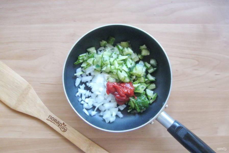 Накройте сковороду крышкой и тушите лук, огурец и томатную пасту 10-12 минут.