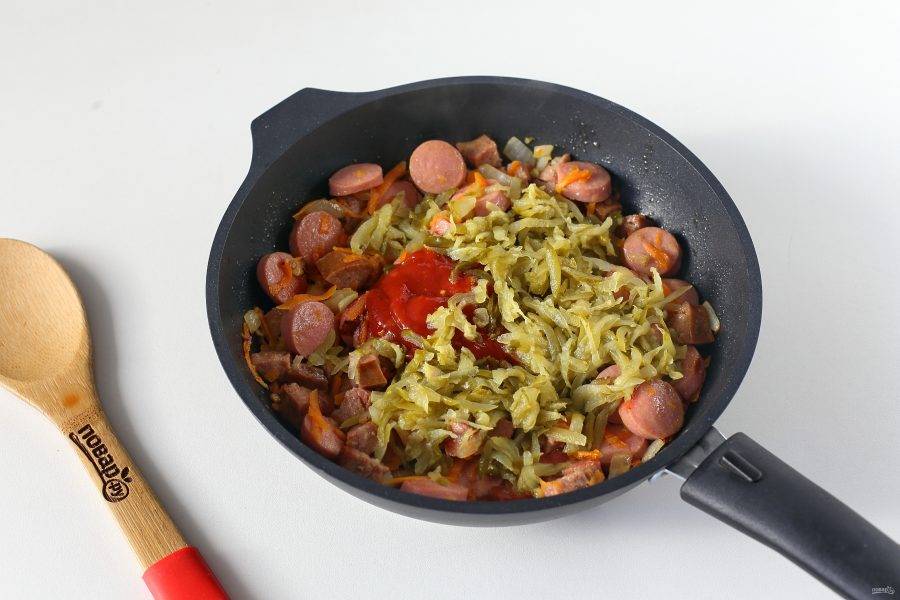 Обжарьте овощи до мягкости. Добавьте нарезанные кружочками сосиски и нарезанную кубиками колбасу.