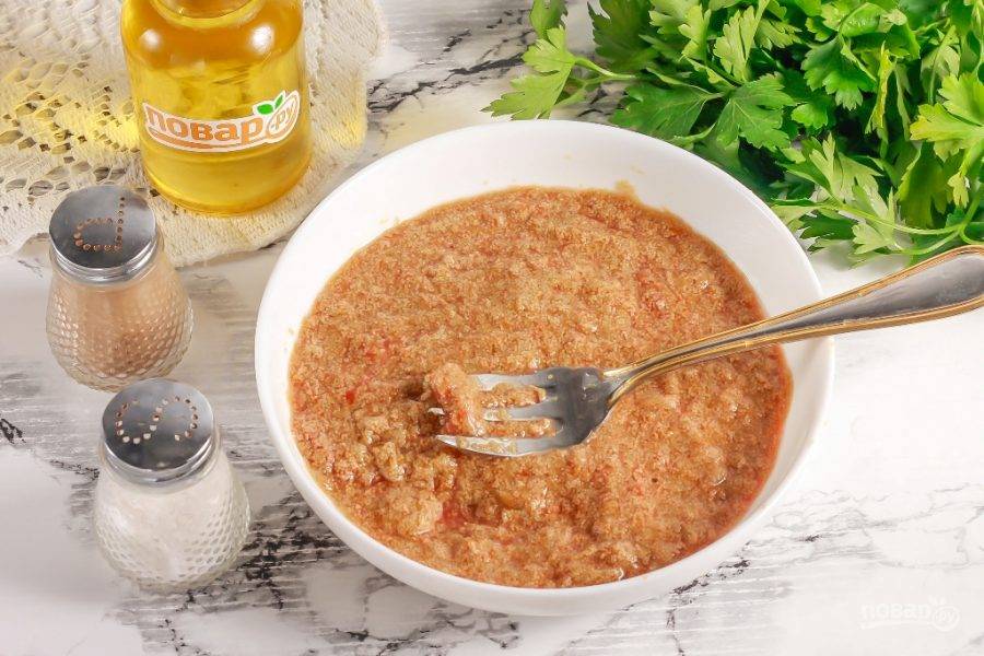 С помощью вилки слегка взбейте икру, чтобы все пленки намотались на вилку. Таким образом вы придадите продукту однородность.