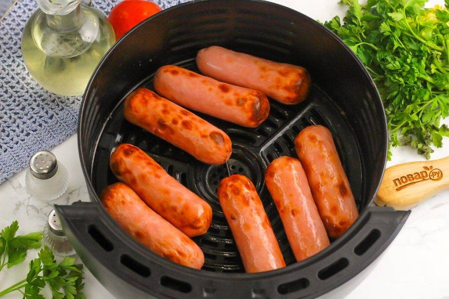 Смажьте поддон аэрогриля растительным маслом, чтобы сосиски не пристали к нему в процессе запекания. Можно использовать пергаментную бумагу или фольгу, смазанную маслом — тогда не нужно будет мыть поддон. Выложите сосиски на поддон на равном расстоянии одна от другой, чтобы они равномерно пропекались.
