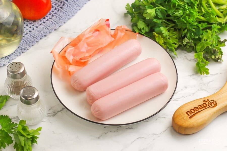 Аккуратно удалите оболочку с каждой сосиски, подрезая ее ножом или ножницами. Если все же вы приобрели колбасу в натуральной оболочке, то ее снимать не нужно — промойте сосиски и подсушите бумажным полотенцем.