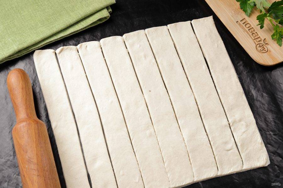 Размороженный пласт теста раскатайте на слегка припыленном мукой столе, в прямоугольник толщиной около 3 мм. Размер готового прямоугольника будет зависеть от размера сосисок и их количества. Нарежьте прямоугольник на длинные полоски шириной около 1,5-2 см. по количеству сосисок. Длина полосок зависит от длины ваших сосисок.