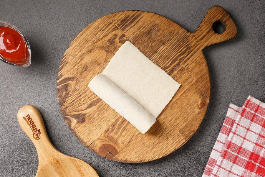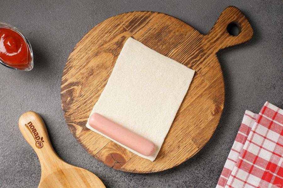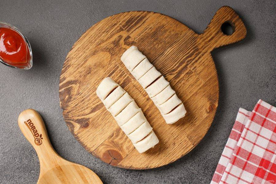 Рабочую поверхность посыпьте мукой. Раскатайте тесто в форме прямоугольника и нарежьте на полоски, шириной по размеру и количеству сосисок.