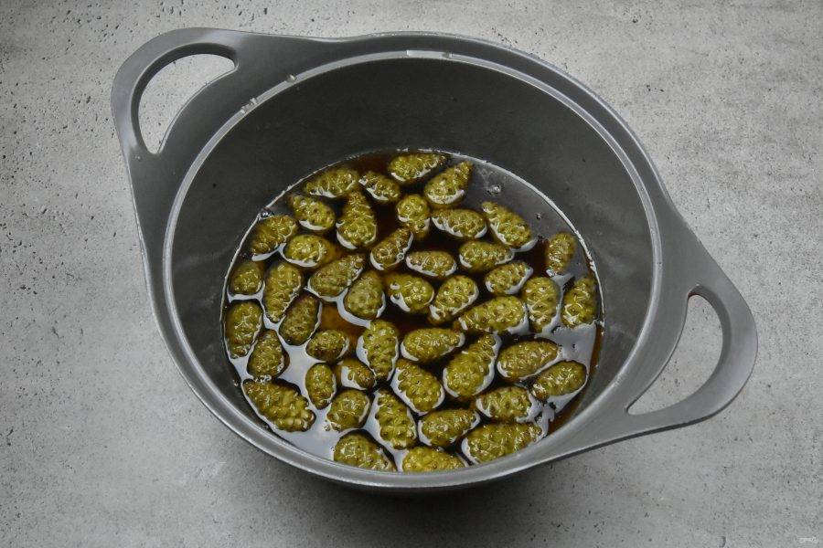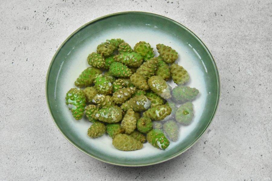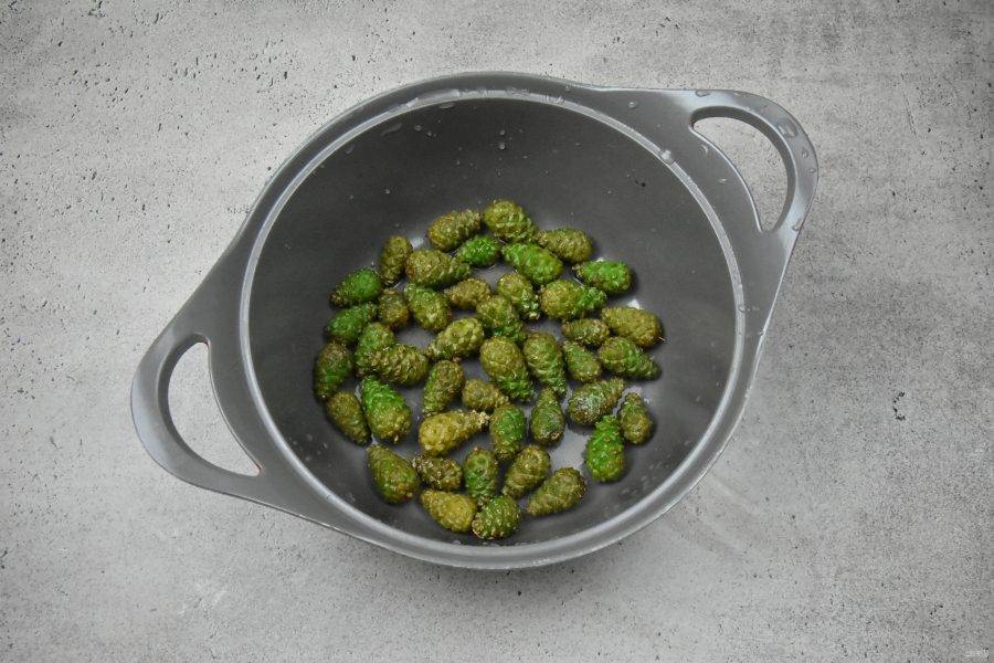Слейте с шишек воду, ополосните их под проточной водой. Переложите в посуду в которой будете варить варенье. При варке с шишек выделяется смола и она налипает на стенки кастрюли, которую трудно омыть. Учитывайте это при выборе посуды.