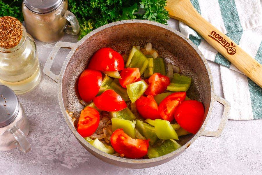 Промойте помидоры и перец, вырежьте из перца семена, а из томатов — зеленые сердцевинки. Нарежьте крупными кусочками и добавьте в емкость. Нарезка для соте должна быть крупной! Потушите примерно 5-7 минут на умеренном нагреве — томаты выделят сок.
