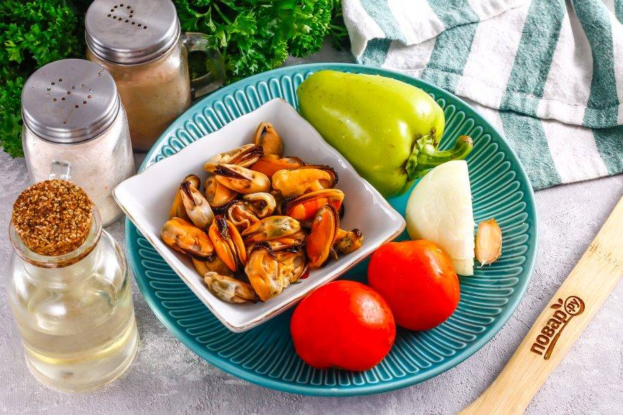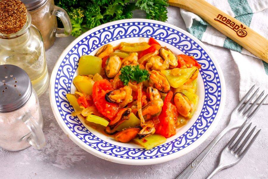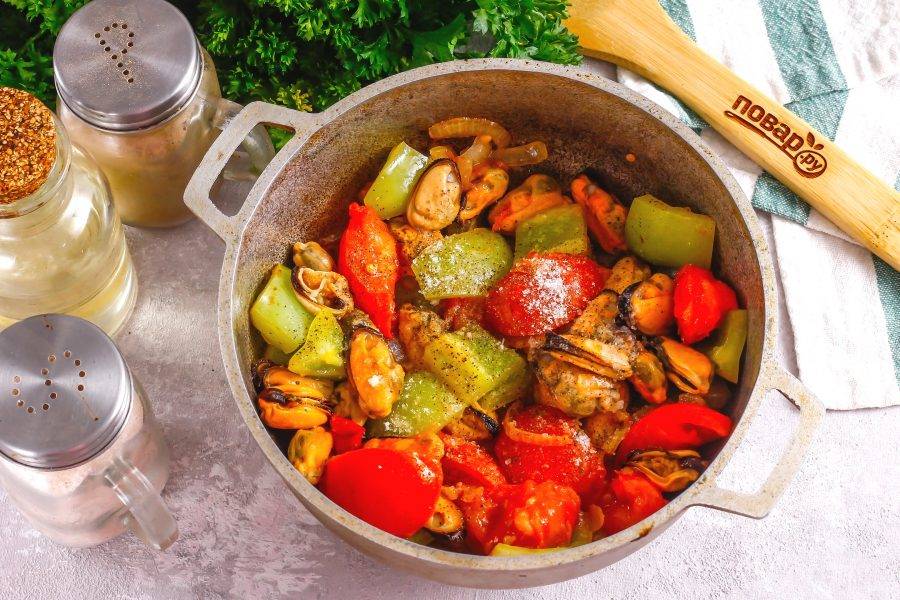 Посолите и поперчите блюдо, перемешайте и потушите примерно 2-3 минуты, чтобы мидии впитали в себя овощной соус.