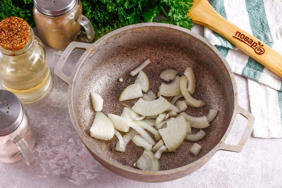 Очистите луковицу и зубчики чеснока от кожуры, промойте в воде и нарежьте мелкими кубиками. Прогрейте в казане или на сковороде с высокими бортиками растительное масло и высыпьте в него луковую и чесночную нарезки. Обжарьте в течение 2-3 минут.