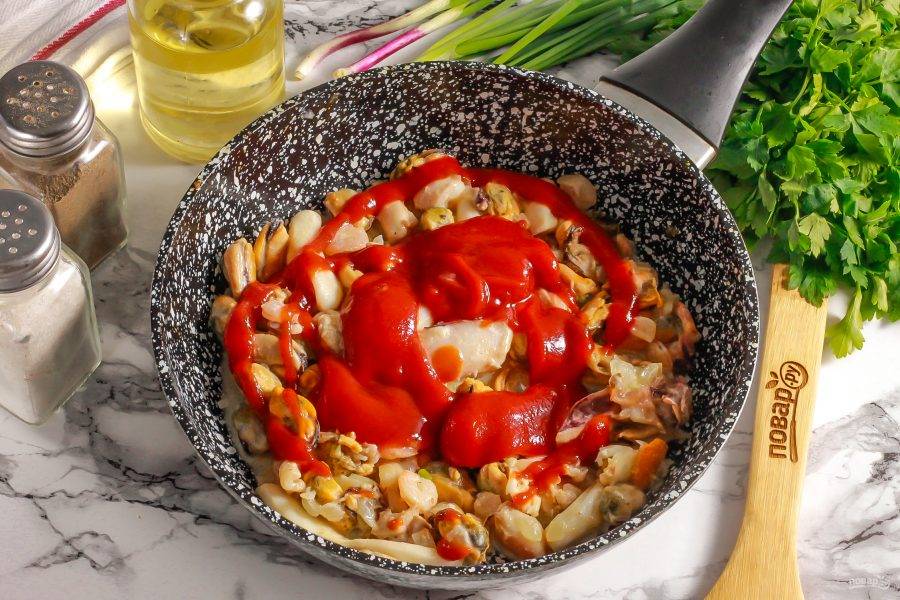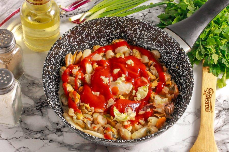 Самый простой вариант приготовления морепродуктов — вкусное и красочное соте. Добавляйте томатную пасту или кетчуп, мякоть консервированных томатов, получая вкусный соус с чесночным ароматом.