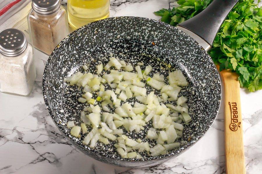 Нарежьте лук мелкими кубиками. Если луковицы маленькие, то используйте две-три штуки. Разогрейте в сковороде растительное масло и обжарьте в нем лук примерно 3-4 минуты.