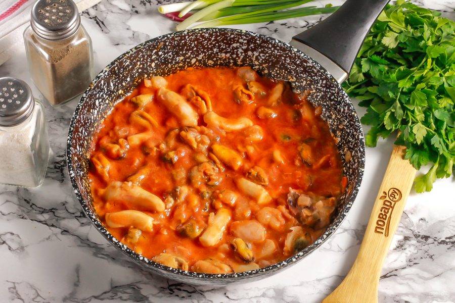 Потушите все примерно 1-2 минуты, чтобы чеснок прогрелся и отдал соусу свой аромат. Воду добавлять не нужно, морепродукты выделят жидкость при тушении.