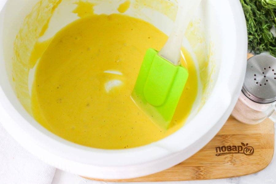 Как только это произойдет, тонкой струйкой начните вливать растительное масло без запаха, не прекращая взбивать. Если у вас на кухне нет такой техники, воспользуйтесь глубокой миской, которую нужно поместить на паровую баню, и венчиком.