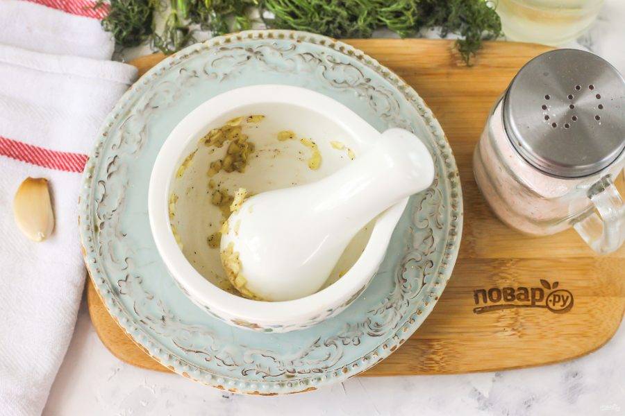 Очистите зубчик чеснока и промойте в воде, можно использовать несколько зубчиков, если вы любите более пикантный вкус соуса. Измельчите чеснок и выложите в ступку, поперчите.
