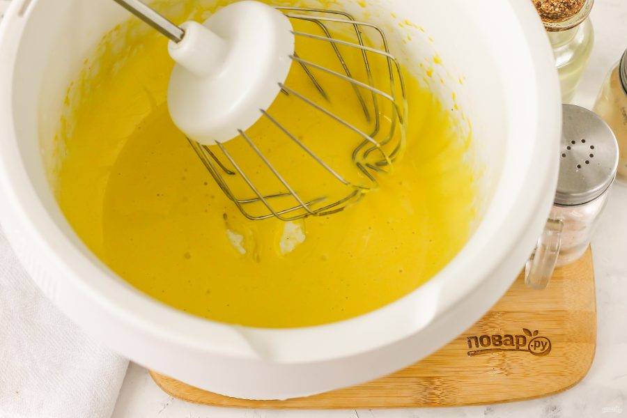 Выложите желтки в чашу кухонного комбайна или блендера, добавьте соль, горчицу. Тщательно взбейте все содержимое емкости в течение 4-5 минут, чтобы желтки побелели.