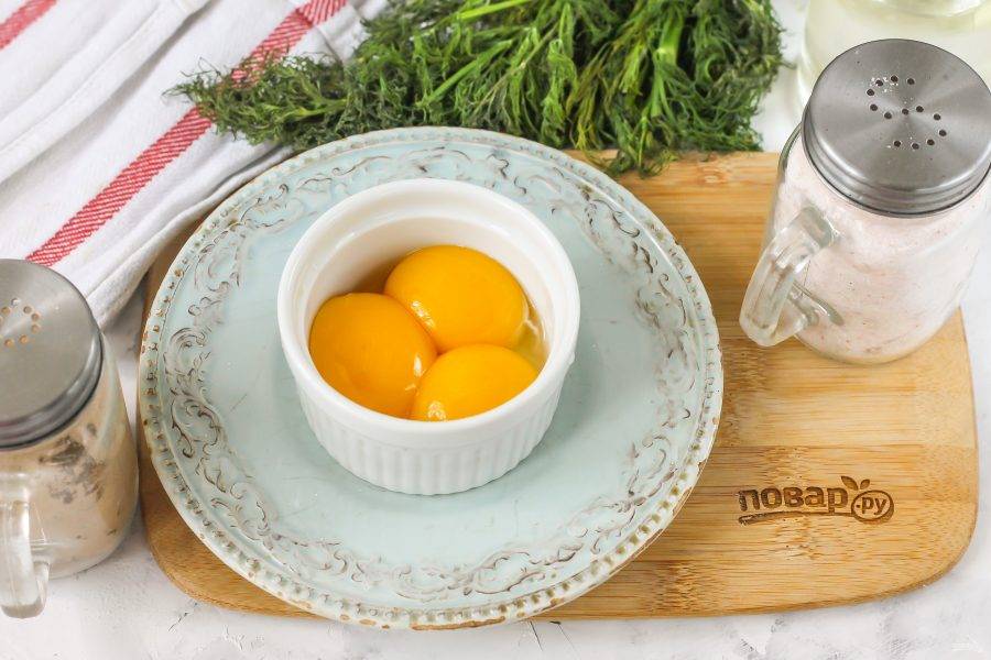 Отделите желтки от белков, аккуратно разбивая куриные яйца. Белки используйте при приготовлении других блюд.