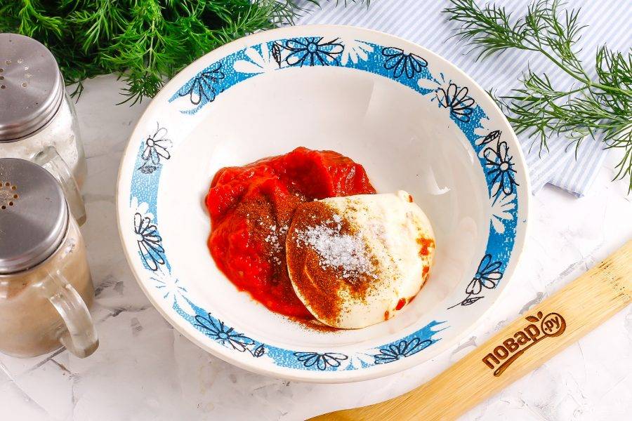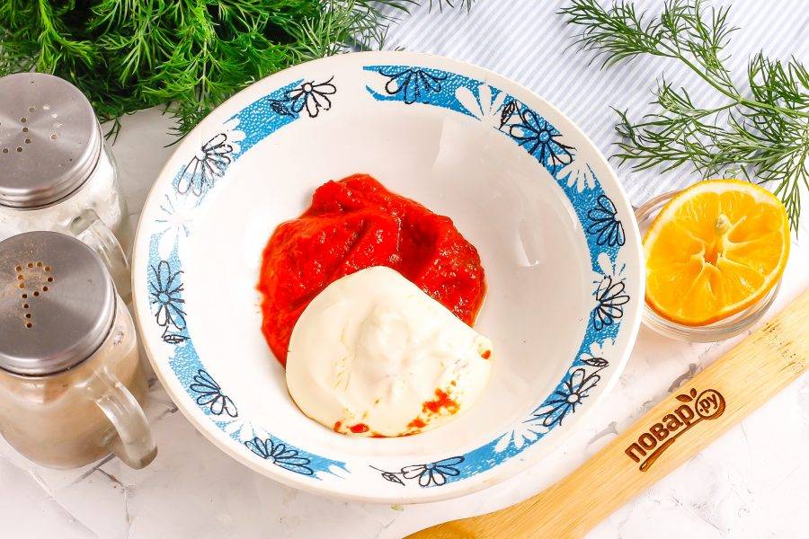 В глубокую емкость выложите кетчуп и майонез. Влейте туда же лимонный сок или выжмите сок из четверти лимона.