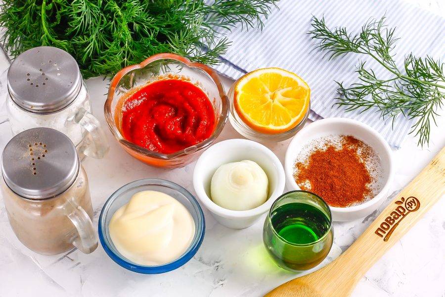 Подготовьте указанные ингредиенты. Майонез можно использовать любой жирности и любого вкуса, даже чесночный.