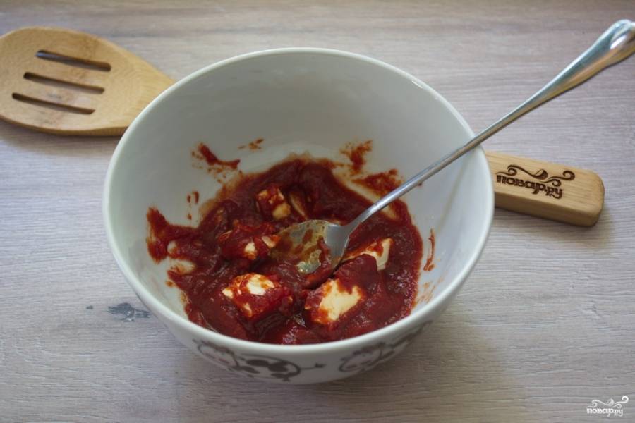 Для приготовления соуса нам необходимо взять сливочное масло. Поместите его в мисочку. Добавьте томатную пасту и 2 ч. ложки питьевой воды. Перемешайте, насколько это возможно. Поставьте емкость с содержимым в микроволновку на 30 секунд. Масло должно растопиться. Смешайте его с томатной пастой и водой, снова поставьте в микроволновку на 10 секунд. Перемешайте.