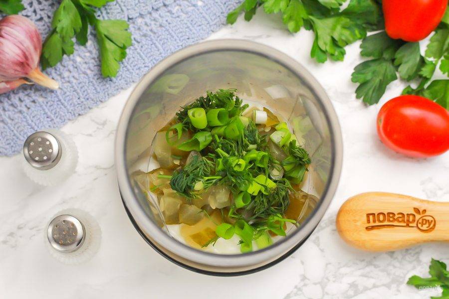Промойте зеленый лук и укроп, измельчите. Добавьте в емкость. По желанию можно добавить и петрушку, стеблевой сельдерей.