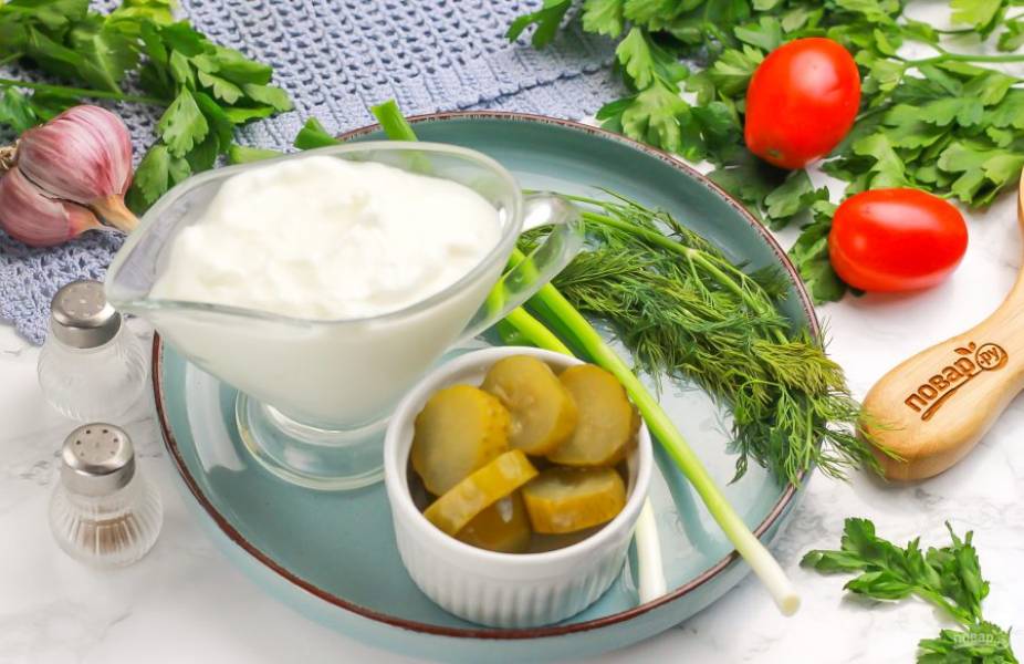 Самый простой вариант приготовления закусочного соуса — с солеными огурцами. Его основой могут быть сметана, классический йогурт, кефир и т.д. Добавляйте свежую зелень, специи и пряности по вкусу.