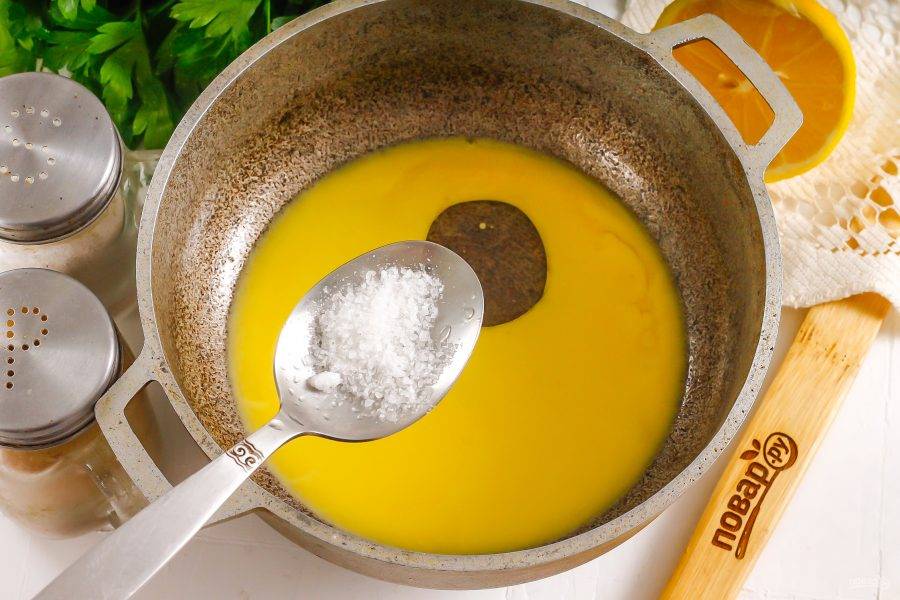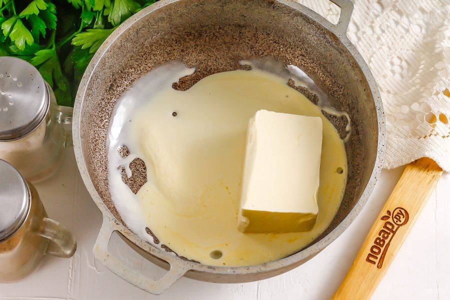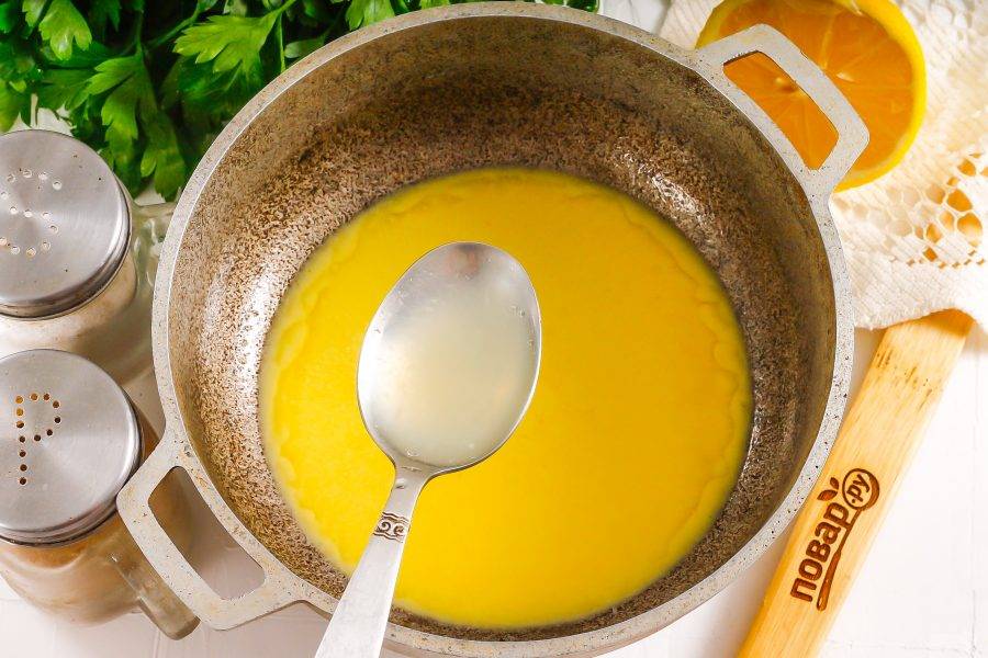 Сливочное масло растопите в казане или в сковороде с высокими бортиками.