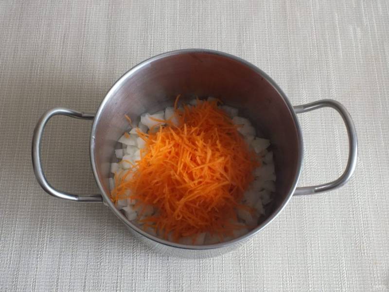 Нарежьте мелко лук и натрите на мелкой терке морковь. Разогрейте в сотейнике/кастрюле масло с водой и потушите овощи до полуготовности на малом огне под крышкой.