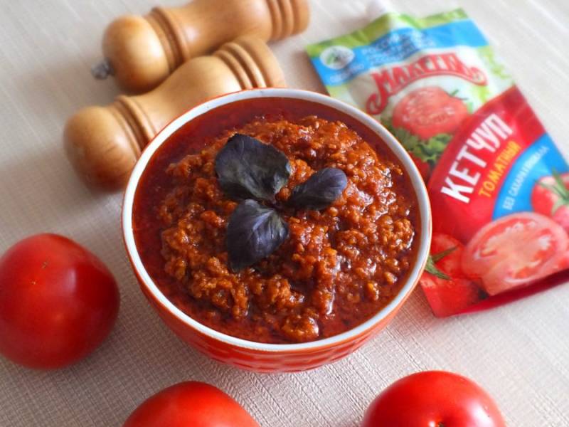 Соус "Болоньезе" с кетчупом можно смешивать с овощами, макаронными изделиями, делать с его использованием запеканки, пармиджано. Выбирайте по вкусу. Приятного аппетита!