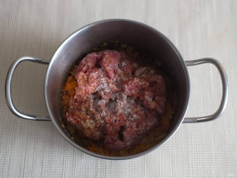 К полуготовым овощам добавьте фарш, соль, специи по желанию. Перемешайте и обжарьте все вместе, не допуская образования корочки.