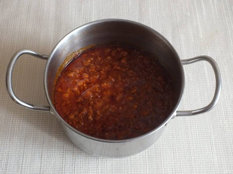 К фаршу добавьте разведенный водой кетчуп и влейте еще 0,75 ст воды. Перемешайте, закройте крышкой и установите огонь ниже среднего. Варите 1 ч. 30 минут, периодически помешивая.