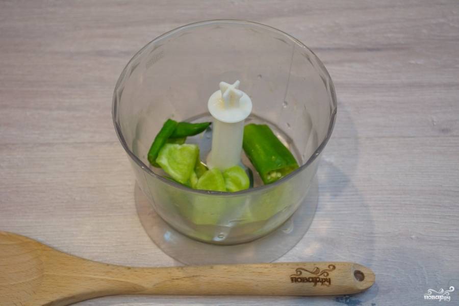 Соус "Чимичурри" готовят из зеленого острого перца с добавлением зелени, уксуса, масла и специй. Итак, наденьте перчатки на руки. Жгучий перец хорошо проникает в кожу и очень опасен для глаз, поэтому лучше работать в перчатках. Очистите перец от семян. Поместите его в блендер.