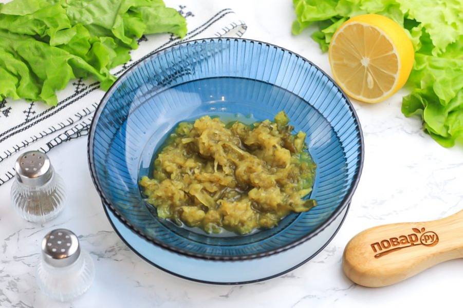 Квашеные огурцы промойте в воде, натрите на терке с мелкими ячейками в миску или пиалу. Оставьте на 2-3 минуты и отожмите от выделившегося рассола. Рассол слейте, оставляя лишь мякоть.