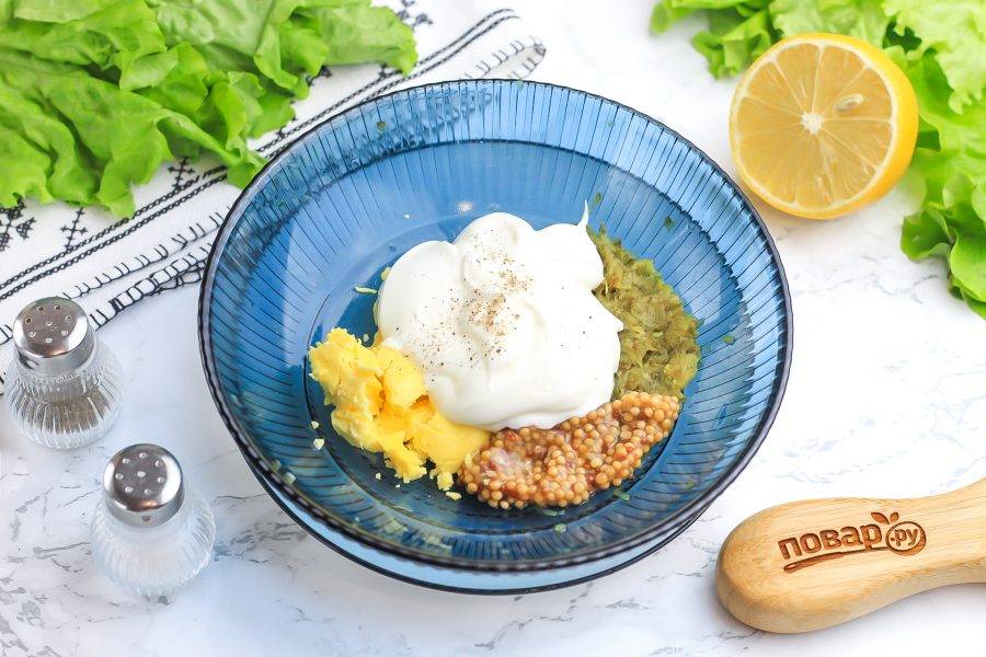 Добавьте сметану любой жирности или густой классический йогурт, влейте лимонный сок, всыпьте соль и молотый черный перец.