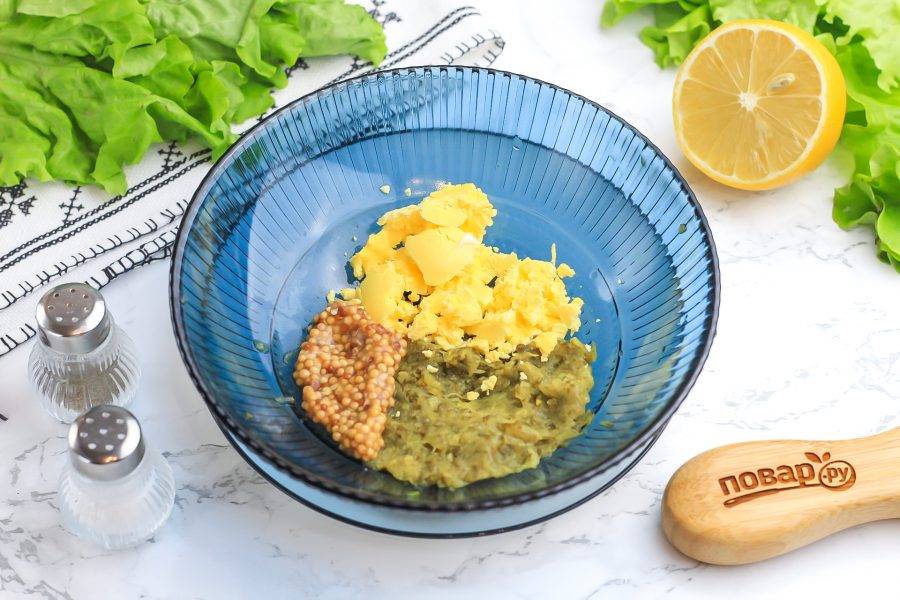 Добавьте зерновую горчицу (магазинную) и раскрошите отварной куриный желток. Вареный белок не пригодится.