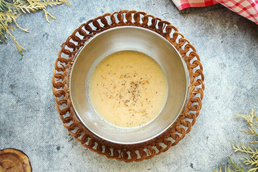 Пробейте все погружным блендером до однородной эмульсии. Добавьте вустерский соус, поперчите, перемешайте и сразу подавайте на стол к салату "Цезарь".