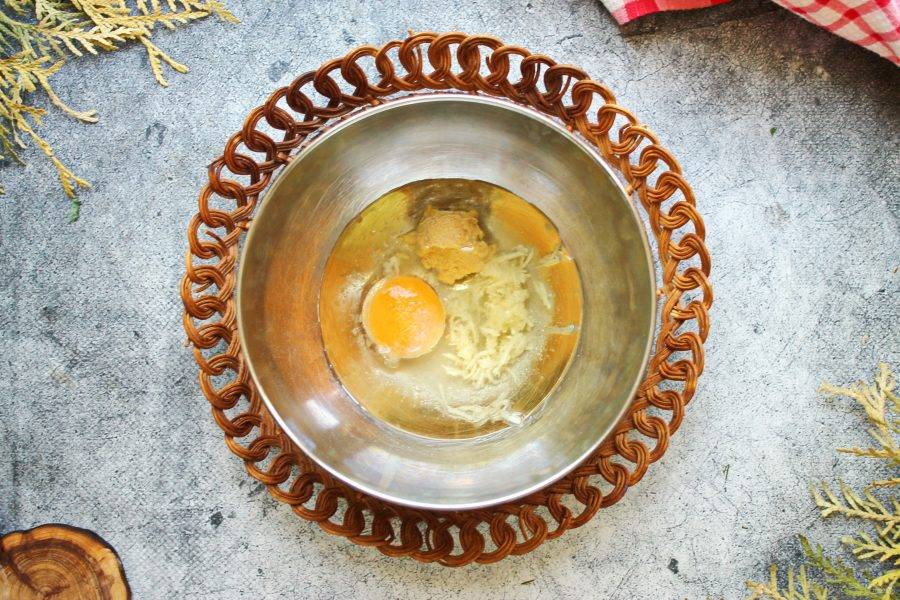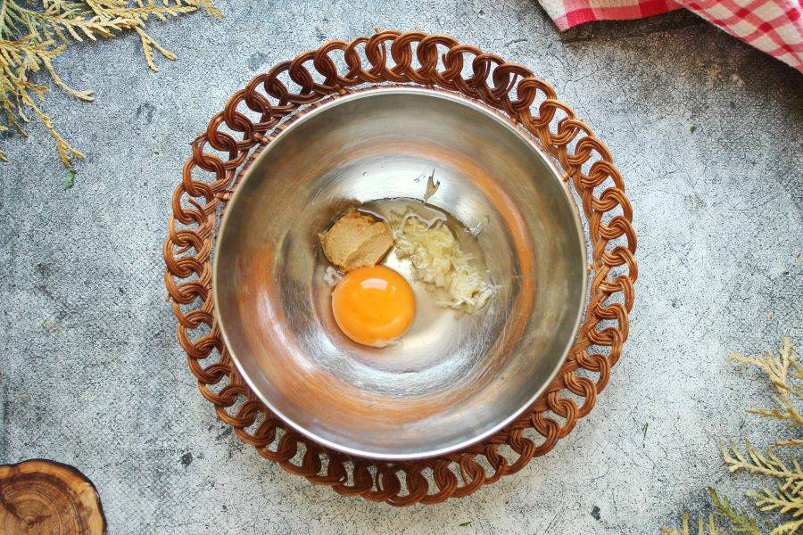 Разделите яйцо на белок и желток. Желток выложите в миску, белок не понадобится. Добавьте к желтку горчицу и измельченный чеснок.
