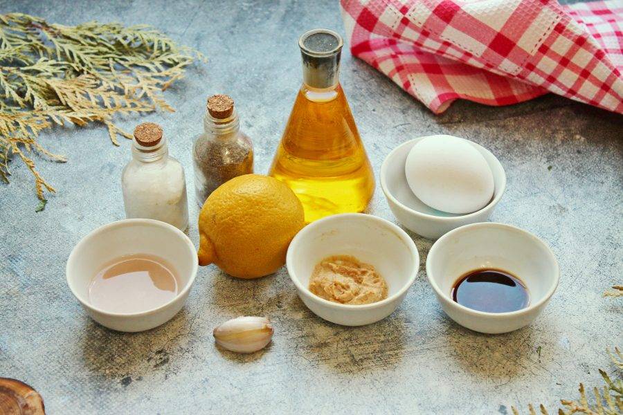 Подготовьте все необходимые ингредиенты для приготовления соуса для салата "Цезарь" без анчоусов.