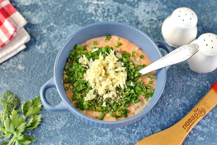 Перемешайте. Добавьте измельченный укроп, петрушку и зеленый лук. Чеснок пропустите через пресс. Специи можно добавлять любые по вкусу. У меня прованские травы.